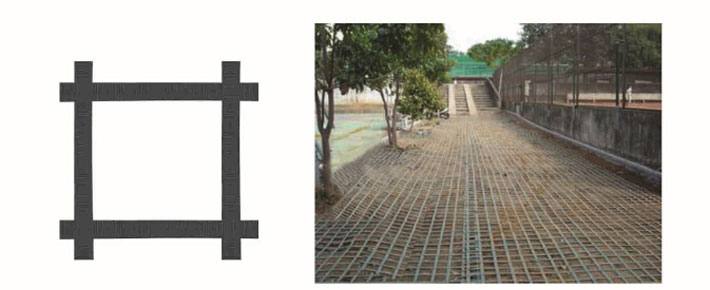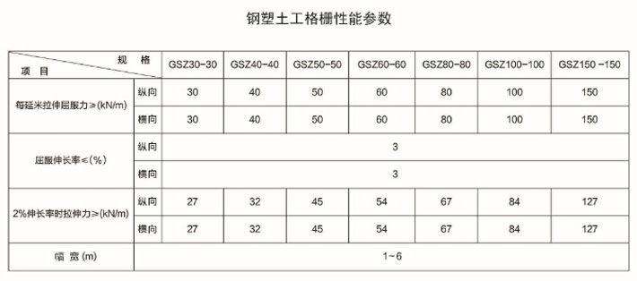 鋼塑復合土工格柵是用聚丙烯、聚氯乙烯等高分子聚合物經(jīng)熱塑或模壓而成的二維網(wǎng)格狀或具有一定高度的三維立體網(wǎng)格屏柵。由于塑料土工格柵在制造中聚合物的高分子會隨加熱延伸過程而重新排列定向,加強了分子鏈間的聯(lián)結力,達到了提高其強度的目的。其延伸率只有原板材的10%~15%。如果在土工格柵中加入炭黑等抗老化材料,可使其具有較好的耐酸、耐堿、耐腐蝕和抗老化等耐久性能。